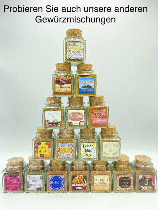 Zutaten: Koriandersamen, getrocknete Minze, gemahlene Orangenschalen, gemah. Limettenschalen, braune Zucker, Kurkuma, Schwarzer Pfeffer, Zimtpulver, Piment, Chilipulver
